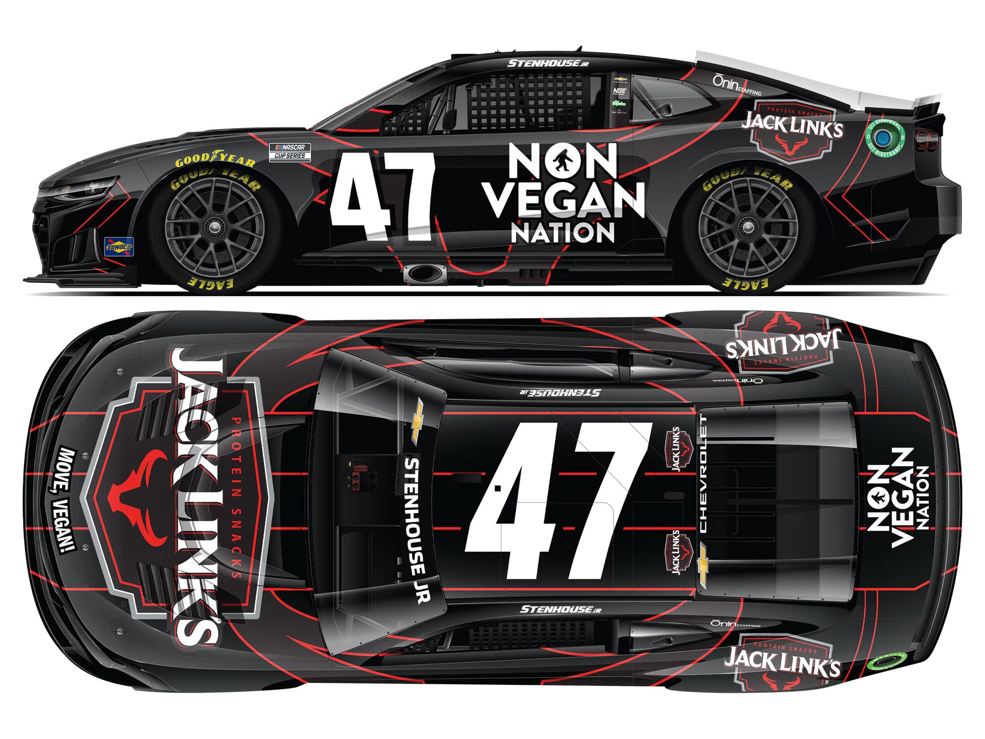 Non Vegan Nation unites at Martinsville Speedway as Ricky Stenhouse Jr. goes to battle with a veggie-unfriendly No. 47 Jack Link’s Chevrolet. Now, Stenhouse’s fans and non-vegans everywhere can add the official Lionel Racing die-cast of the No. 47 Jack Link’s Non Vegan Nation Chevy to their NASCAR® collections.